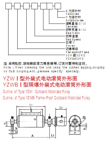 該產(chǎn)品是供各種固定式帶式輸送機(jī)、斗式提升機(jī)、卷?yè)P(yáng)機(jī)等配套的新型驅(qū)動(dòng)裝置。其內(nèi)部采用行星擺線減速機(jī)構(gòu),使電機(jī)外露與滾筒直聯(lián),具有承載能力大、過(guò)載能力強(qiáng)、傳動(dòng)平穩(wěn)、噪音低、壽命長(zhǎng),使用維修方便,操作安全可靠等優(yōu)點(diǎn)。可滿足各種逆止、包膠等要求。隔爆外裝式電動(dòng)滾筒其隔爆標(biāo)志位dl、dllAT4。dl適合于有甲烷或煤塵礦井中,dllAT4適合于有I、IIA級(jí)T2~T4組爆炸危險(xiǎn)性混合物存在的場(chǎng)所,dllBT4適用于有I、IIA、IIB級(jí)T2~T4組爆炸危險(xiǎn)性混合物存在的場(chǎng)所。