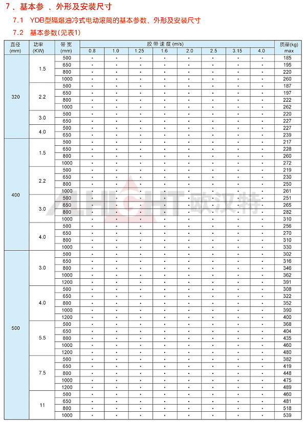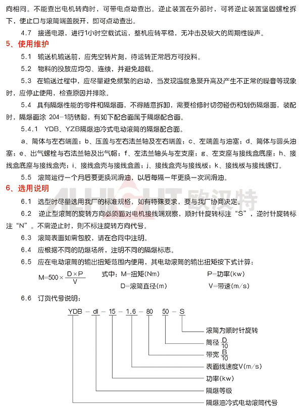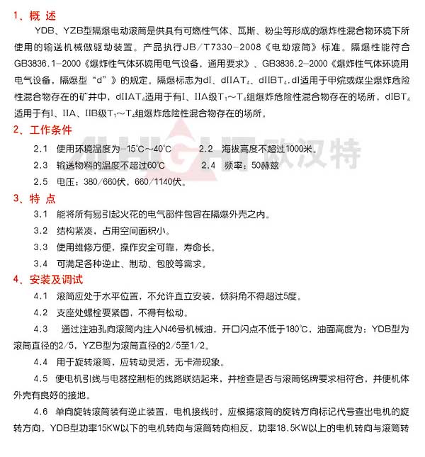 該產品是供具有可燃性氣體、瓦斯、粉塵等形成的爆炸性混合物環(huán)境下帶式輸送機所使用的驅動裝置。產品嚴格執(zhí)行JB/T7330-08《電動滾筒》標準。隔爆性能符合GB3836.1-2000《爆炸性氣體環(huán)境用電氣設備、通用要求》、GB3836.2-2000《爆炸氣體環(huán)境用電氣設備,隔爆型"d"》的規(guī)定。隔爆標志為dl、dllAT4、DllBT4。dl適合于所有甲烷或煤塵爆炸危險性混合物存在的礦井中。
