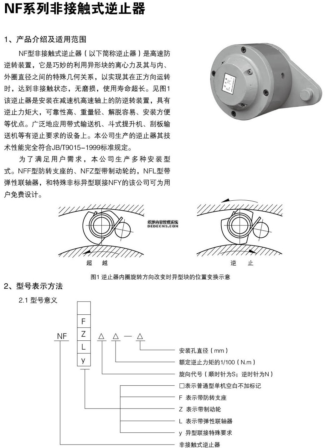 NF型非接觸式逆止器(以下簡(jiǎn)稱逆止器)是高速防逆轉(zhuǎn)裝置,它是巧妙的利用異形塊的離心力及其與內(nèi)、外圈直徑之間的特殊幾何關(guān)系,以實(shí)現(xiàn)其在正方向運(yùn)轉(zhuǎn)時(shí),達(dá)到非接觸狀態(tài),無磨損,使用壽命超長(zhǎng)。