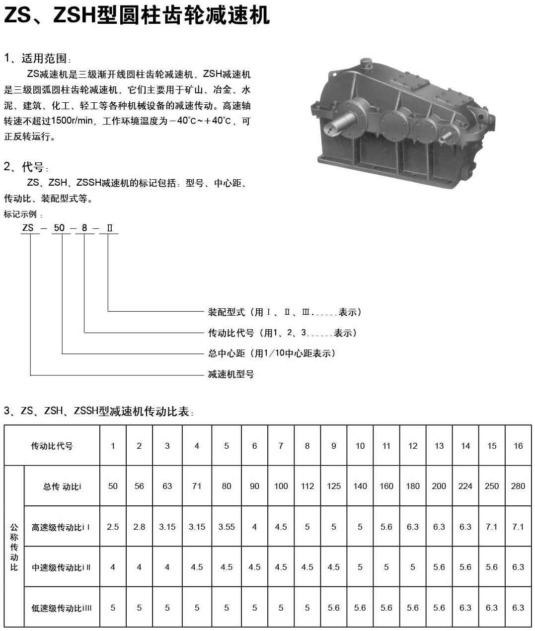 ZS,ZSH型減速機主要用于超重,礦山,通用化工,紡織,輕工等行業(yè),其適用條件如下:減速機齒輪傳動圓周速度不大于4米/秒;高速軸的轉速不大于1500轉/分;用于正反兩向運轉;工作溫度為-40度至40度。九種傳動比,九種配置形式和三種低速軸端型式。 型號標記示例:ZS(ZSH) - 500-5- II ZS(ZSH)是減速機型號,500是總中心距,5是傳動比代號,II裝配形式。
